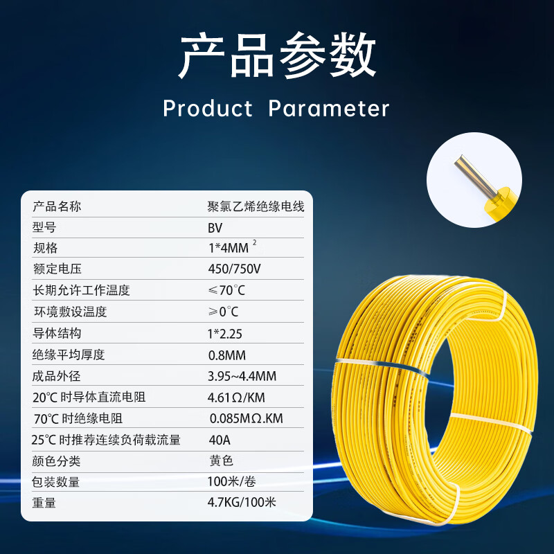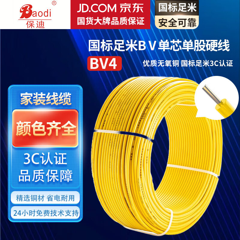 保迪 电线电缆 BV1*4平方450/750V 单芯单股铜芯塑料线 国标照明家装铜芯电线 黄色100米